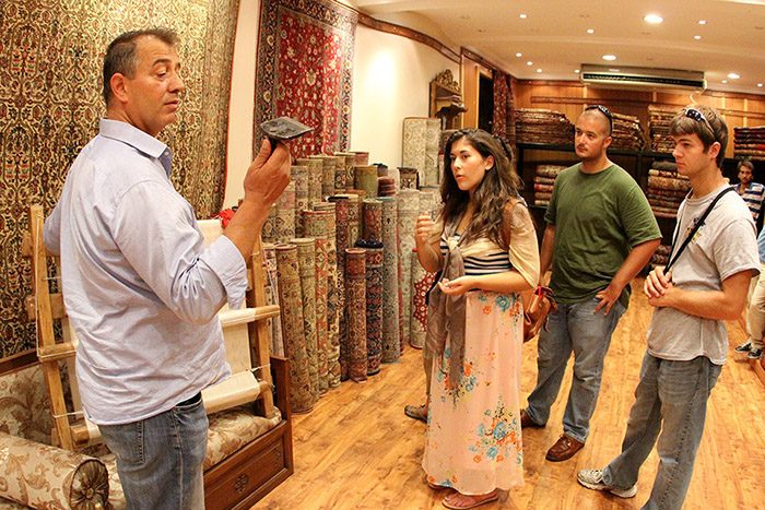 While entering his shop you feel the need to duck your head, as if you’re walking into a hidden cave full of treasures. Rugs paint the walls, turning themselves into tapestries, your jaw goes slack and eyes open an extra few millimeters to absorb the colors and designs that dance in your plane of view. The owner, Serdar Takan, led us to the back showroom; apple tea was handed to us shortly thereafter. All four of us took seats on the low-lying, padded benches lining the room. Serdar and his workers began showing us 100 percent silk rugs, most of which measured nine by six feet. Every time a new rug was unrolled with exacting finesse, the thread count climbed higher.