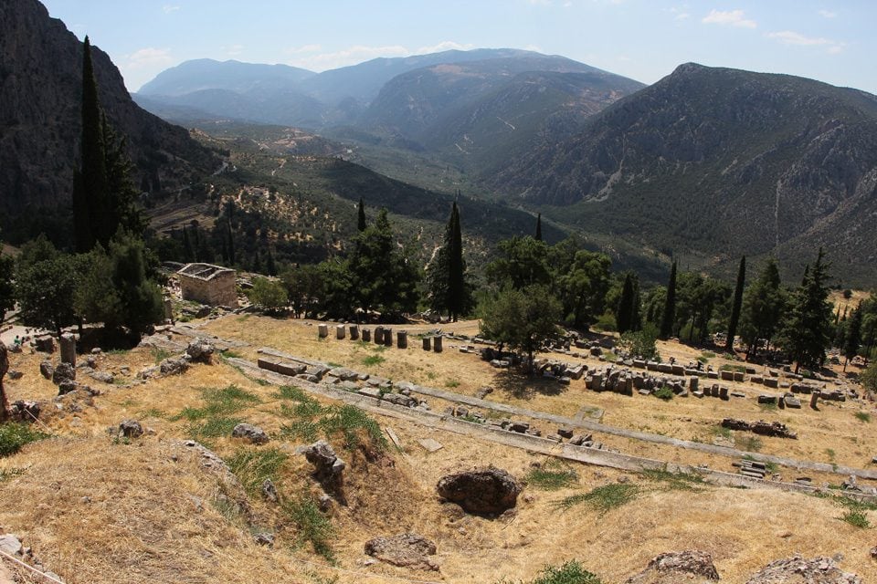 First they heard the legend of how Delphi became the center of the ancient world. Apollo released two birds at opposite ends of the earth at the same time. They met at Delphi, proving that Delphi was the center of the world.