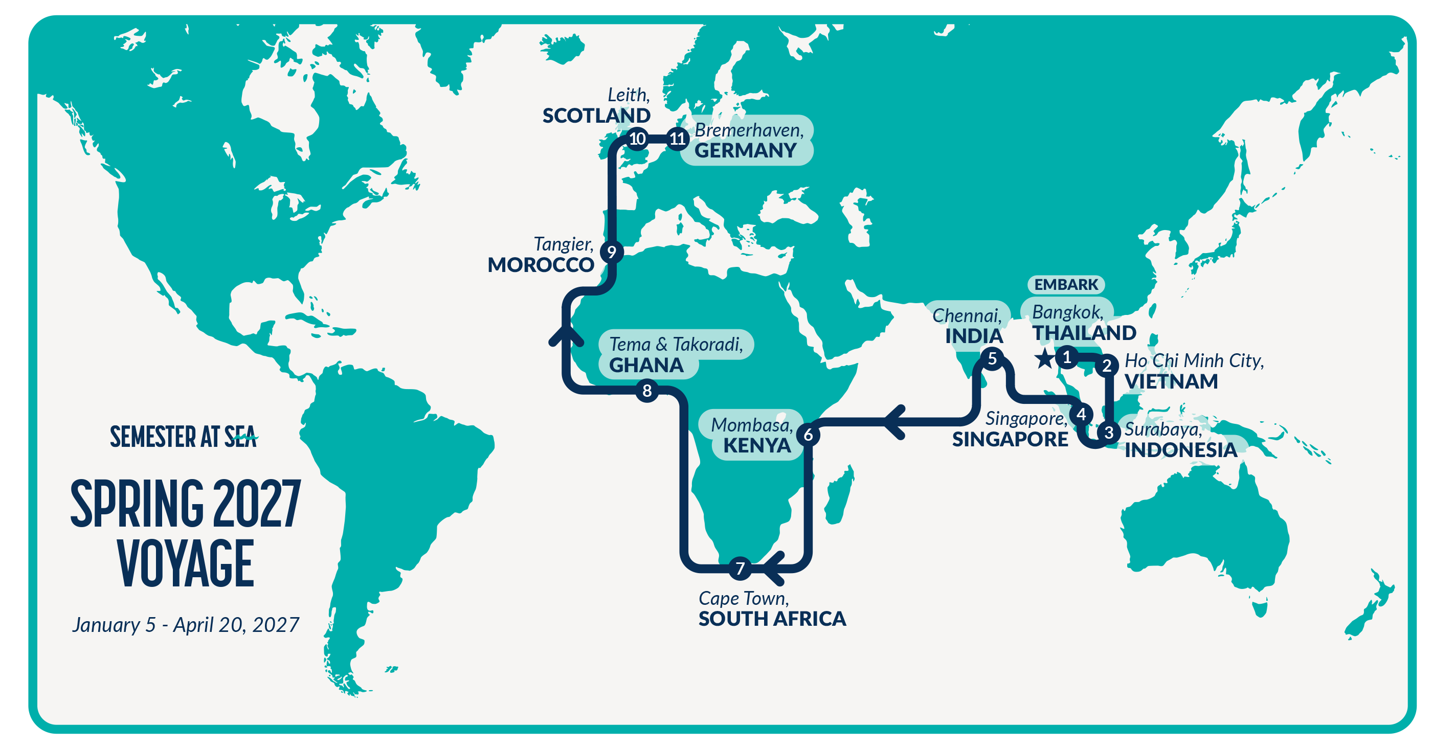 Exploring countries in Asia, Africa, and Europe, this voyage takes participants gives participants a truly global study abroad experience on our floating campus!